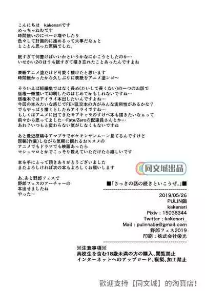 "Sakki no Hanashi no Tsuzuki to Ikou ze."